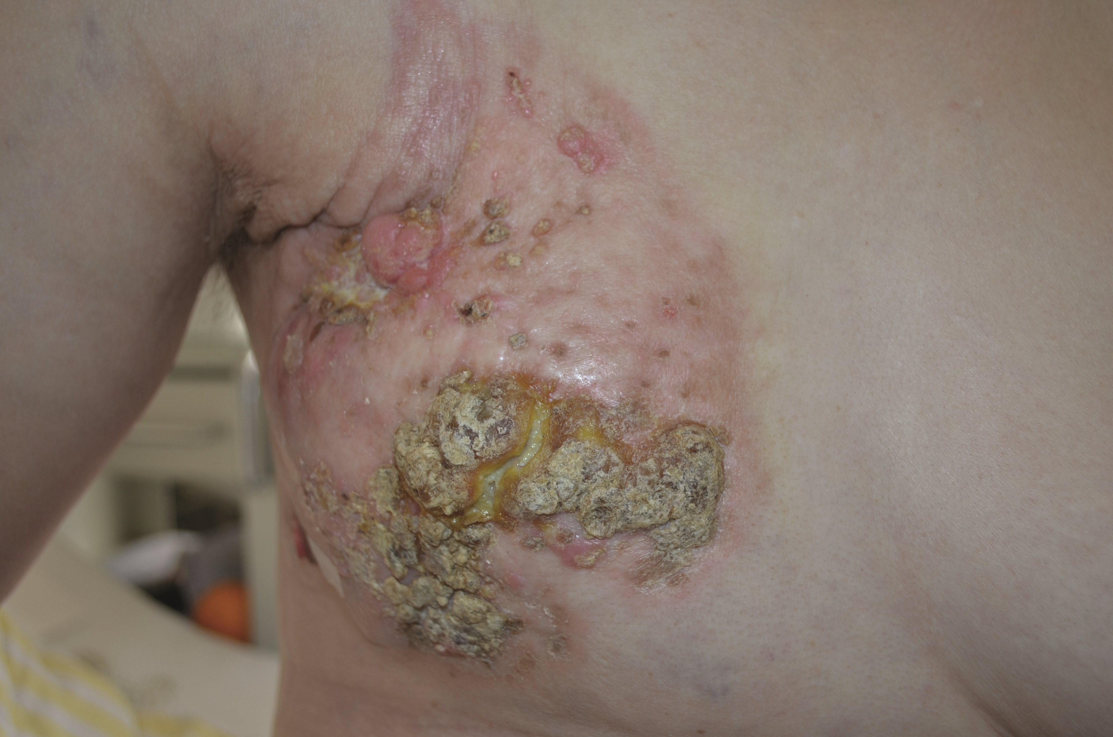 – when a tumour that is growing under the skin breaks through the skin’s surface and creates a wound. As the cancer grows, it can block and damage blood vessels, reducing oxygen supply to the surrounding skin and tissue causing necrosis.
