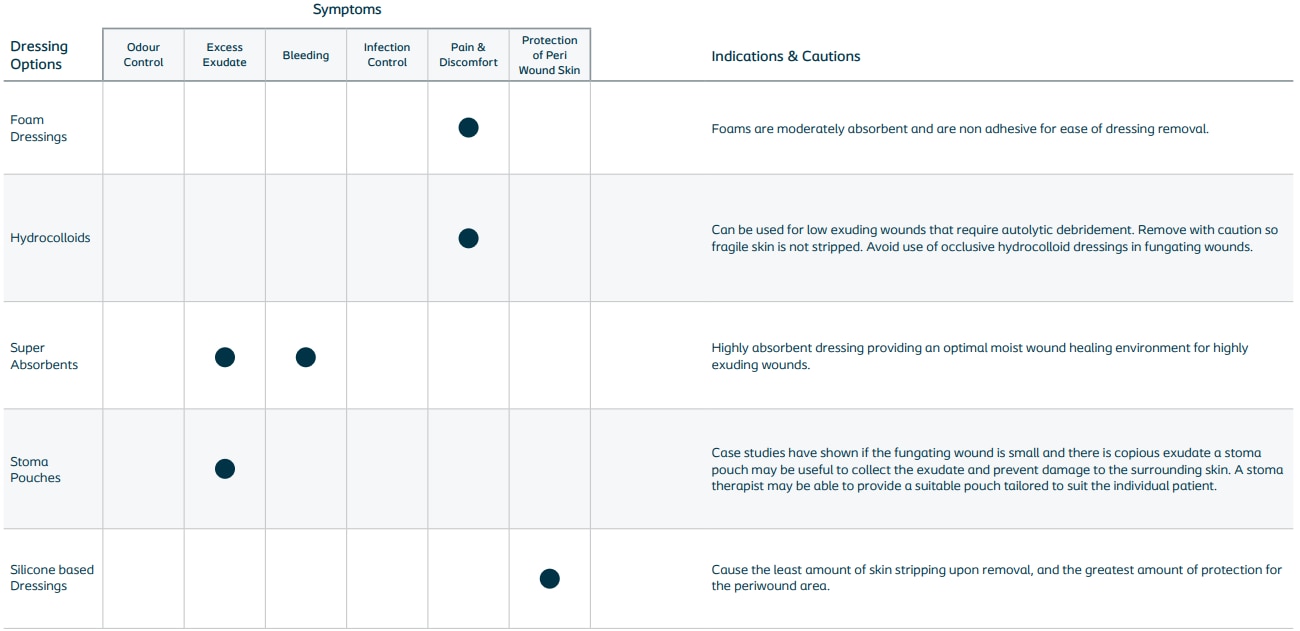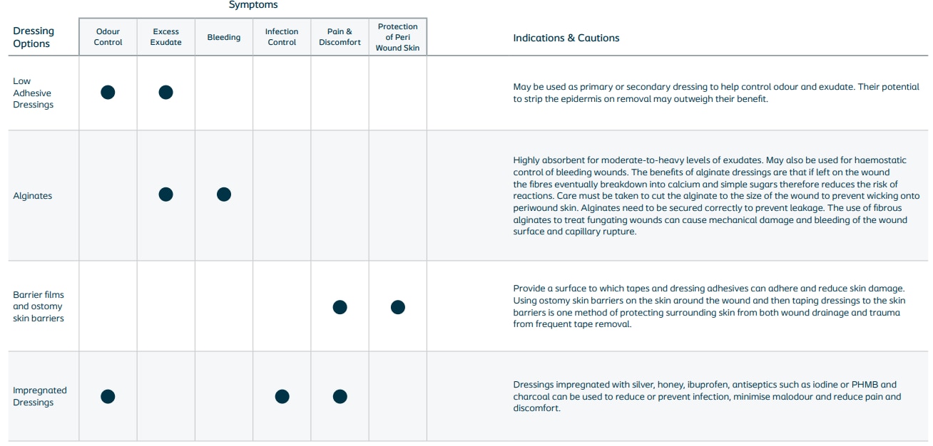 ➔ Malignant wounds are often highly exudating and irregular in size and shape, which makes them difficult to dress and may require an unorthodox approach. A multiple layered dressing approach may be required. Dressing selection should be based on patient needs and preferences and local policy/protocol/formularies. The following chart (see below) breaks down some of the basic theory around dressing types and how they can help manage symptoms for patients with malignant fungating wounds.